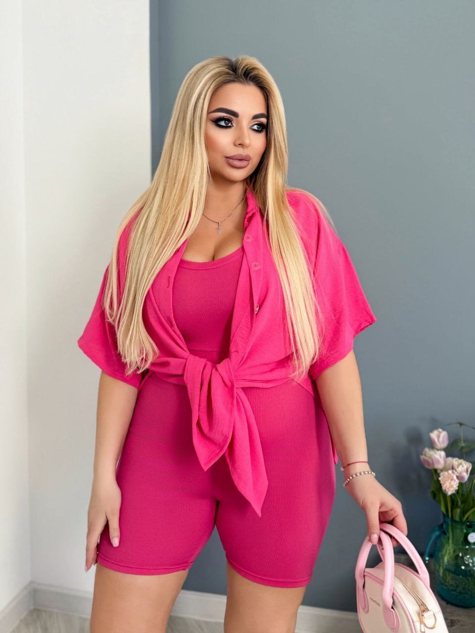 Сорочка+комбенезон. Сорочка подовжена, з планкою, на ґудзиках, із розрізами з боків. Комбенезон приталений без кишень.